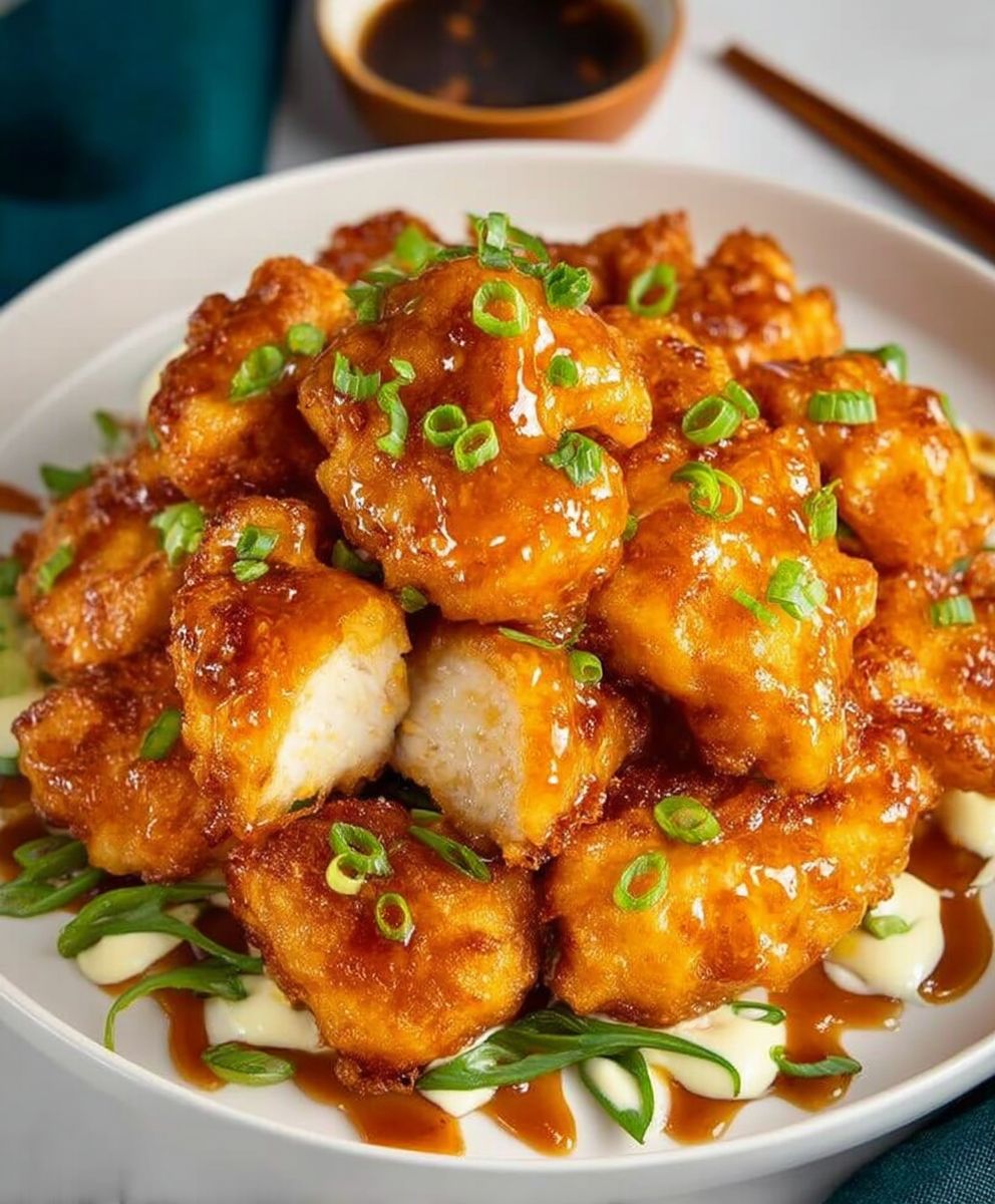 Once all the crispy chicken is cooked, transfer it to a large bowl. Pour the freshly made Bang Bang sauce over the chicken and toss gently until every piece is gloriously coated. Ensure an even distribution of that sweet, spicy, and creamy goodness. Transfer to plates and drizzle with sauce for the perfect finishing touch, garnishing with fresh chives or sliced green onions.