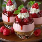 Follow these simple steps to prepare this delicious dish: Step 1: Prepare the Cookie Crust In a food processor, finely crush about 20 Oreo cookies (without filling) or 1 ½ cups of graham cracker crumbs until they resemble fine sand. Melt ½ cup of unsalted butter or plant-based butter. Combine the melted butter with the crushed crumbs in a medium bowl, mixing until fully moistened. Press the mixture firmly into the bottom of individual serving glasses for parfaits or into mini tart molds. Chill in the refrigerator for at least 30 minutes to set. Step 2: Craft the Velvety Chocolate Layer In a mixing bowl, combine 8 ounces of softened cream cheese (or plant-based cream cheese), ½ cup of granulated sugar, and ⅓ cup of unsweetened cocoa powder. Beat with an electric mixer until smooth and creamy. In a separate cold bowl, whip 1 cup of very cold heavy whipping cream (or plant-based whipped topping) with 1 teaspoon of alcohol-free vanilla extract until stiff peaks form. Gently fold half of the whipped cream into the chocolate cream cheese mixture until just combined. Dissolve 1 teaspoon of agar-agar powder in 2 tablespoons of warm water, then stir it into the chocolate mixture to help it set. Step 3: Assemble the Chocolate Raspberry Parfaits Spoon a layer of the chocolate mixture over the chilled crust in your serving glasses. Arrange a few fresh raspberries around the edge of the glass, pressing them slightly into the chocolate. Top with another layer of chocolate mixture, if desired. Alternatively, create a thinner raspberry layer by gently mashing ¼ cup of raspberries with a teaspoon of sugar and layering that in. Place the remaining whipped cream into a piping bag fitted with a star tip (or use a spoon). Step 4: Layer and Chill Pipe or spoon a generous dollop of the remaining whipped cream onto the top of each parfait. Garnish with a few whole fresh raspberries and, if you’re feeling fancy, a sprinkle of chocolate shavings or a drizzle of melted chocolate. For the mini berry tarts, spoon the creamy filling into the chilled crusts and arrange a colorful array of fresh berries on top. Cover lightly with plastic wrap and chill both parfaits and tarts for at least 2-3 hours, or preferably overnight, to allow them to set completely and flavors to meld beautifully. Step 5: Garnish and Serve Just before serving, consider a final flourish. For parfaits, a dusting of powdered sugar or a fresh mint leaf adds a pop of color. For the tarts, a light glaze made from melted fruit jam (warmed with a touch of water) brushed over the berries will make them shine. Transfer to plates and drizzle with sauce for the perfect finishing touch.