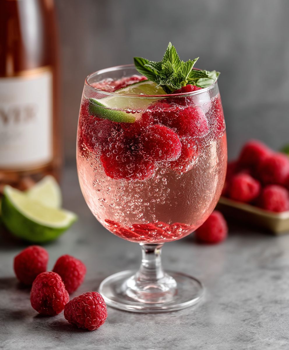 Craft a sweet escape with this Raspberry Moscato Cocktail. Vibrant raspberries meet zesty lime and effervescent non-alcoholic grape juice for a perfectly balanced, romantic drink.